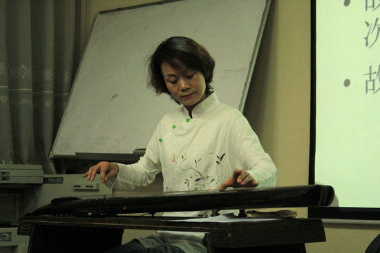 马静女士在表示了对师大学术氛围的敬仰之情后,为大家演奏了一只古琴曲《阳关三叠》,并利用古诗《送元二使安西》启发员工感受古琴与古诗的意境之美。随后何依工副教授对演奏进行了点评,他认为,学习古代文学要有一颗“诗心”,与弹奏古琴一样,身心要达到安静的状态,同时这种学习也应该是生动清新、有趣脱俗的。