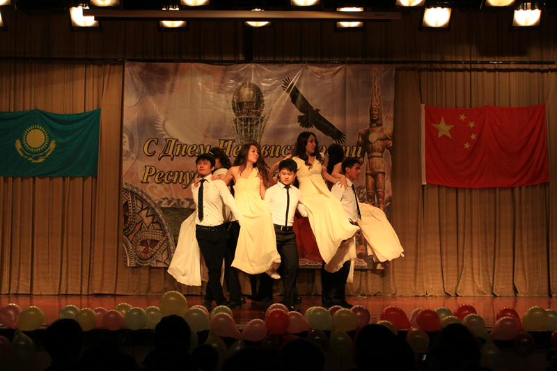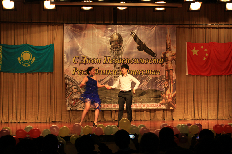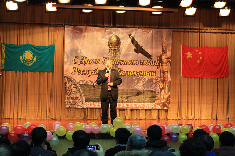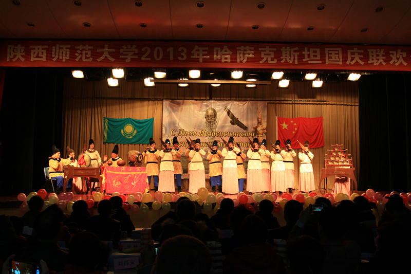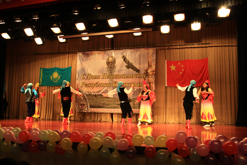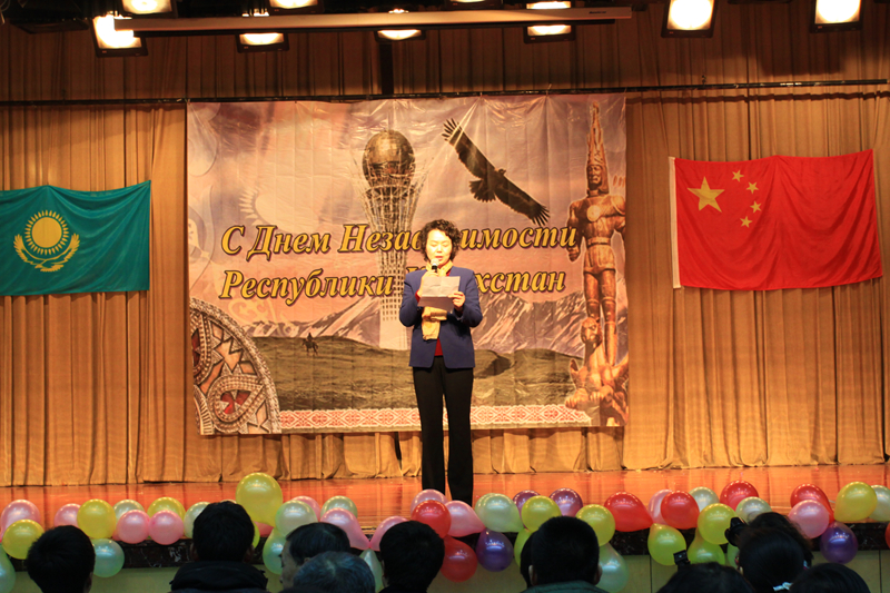 开场舞过后,陕西省文化厅副厅长金育欣,陕西省人民对外友好协会交流处处长刘速平也分别发表了讲话。金育欣副厅长表示,中哈两国有着悠久的交往史,古丝绸之路承载着中哈两国的文明与文化交流,居住在哈萨克斯坦国的“陕西村”东干族也和陕西有着浓浓的亲情和亲切的乡党之情,希望这次哈萨克斯坦国庆联欢会能促进哈萨克斯坦和陕西省的友谊,促进中哈两国的友好文化交流。刘速平处长用“近、稳、快、实”四个字高度概括了中哈两国关系。他她认为,从纳扎尔巴耶夫总统提出“欧亚联盟”到习主席访哈期间提出“新丝绸之路经济带”,中哈关系越来越近,发展速度越来越快,步伐越来越稳,交流领域越来越实,中哈两国的友好关系也达到了一个新的高峰。