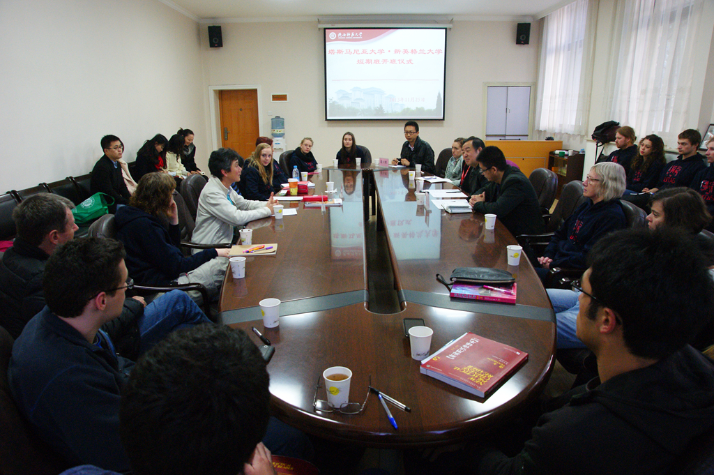 11月25日上午,澳大利亚塔斯马尼亚大学与新英格兰大学汉语言短期进修班开班仪式在伟德国际victor1946一层会议室举行。塔斯马尼亚大学带队老师林嘉惠博士、新英格兰大学带队教师暨该校人文公司中文系主任谭以诗博士、伟德国际victor1946经理张建成、副经理吴殿华以及任课教师代表和来自这两所大学的20名短期班员工出席了开班仪式。仪式由职工管理办公室主任蔺丰辉主持。