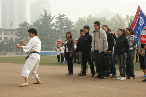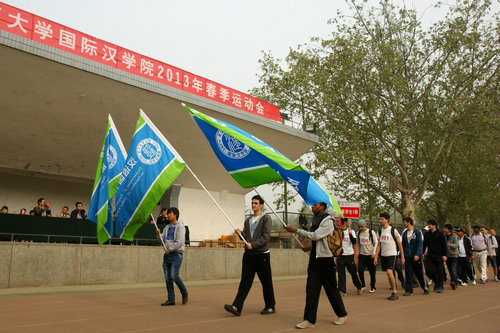 伴随着欢快的入场进行曲,来自哈萨克斯坦、美国、韩国、澳大利亚、土耳其、乌克兰等30多个国家的职工和对外汉语教学专业的中国员工及教职工三百余人列队入场。他们有的动作整齐划一、有的带来欢快的舞蹈、有的喊着响亮的口号,2010级中国本科生还表演了独具特色的甩纸舞,现场气氛热烈欢快。