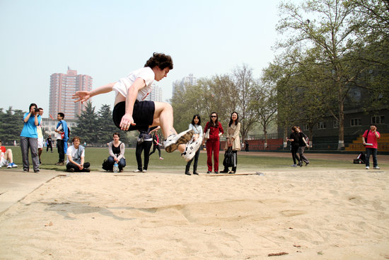 比赛在男子100米预赛中打响第一枪,中外员工互相比拼,加油呐喊。同时田赛组的跳远项目也精彩纷呈。美国员工史孟康甚至跳出了4.96米的好成绩,赢得在场观众的惊叹和赞许。