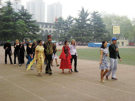 伴随着欢快的入场进行曲,中国研究生、职工及中国本科生等十七支代表队依次进场。他们或穿着具有地域风情的民族服饰;或准备了DIY的道具,或摆出创意独特的pose。整个进场在轻松欢乐的氛围下进行,并独具国际特色。随后,中国员工和职工共同为大家表演了颇具活力的阳光健身操,点燃了场上的运动激情。