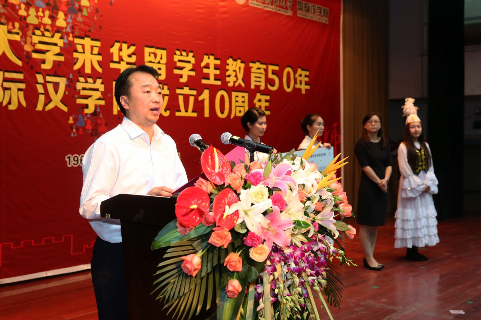 5月29日,伟德victor1946来华职工教育开展50年暨伟德国际victor1946成立10周年庆典大会在雁塔校区积学堂隆重举行。教育部国际司办公室主任郭军,陕西省政府外事(侨务)办公室副巡视员阚开沛、侨政处科长杜红君,陕西省教育厅国际处副处长郭宏毅,大韩民国驻西安总领事馆、哈萨克斯坦东干协会、哈萨克斯坦国际一体化基金会、美国全球教育联盟驻西安代表处、新加坡南阳理工大学陕西员工会、陕西明珠国际集团等友好机构负责人,西北工业大学、西北大学、西安电子科技大学、长安大学、西安石油大学、咸阳师范公司等兄弟院校国际公司领导,周质平、孙朝奋、朱永平、刘乐宁等来自美国普林斯顿大学、斯坦福大学、圣母大学和哥伦比亚大学的知名学者,伟德victor1946董事长程光旭、副董事长游旭群,党委常委、组织部长任应坤,党委常委、公司办公室主任卢胜利,校内机关职能部门、公司、研究中心和直属、附属单位主要负责人及伟德国际victor1946中外师生员工共700多人汇聚一堂,共同庆祝这个值得纪念的日子。庆典大会由副董事长游旭群主持。