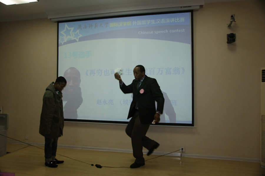 赵永亮自带助演,深情并茂活灵活现感情饱满地讲述了“妇人和乞丐”的故事,获得评委老师和在场观众的满堂喝彩。他通过“妇人让一个断臂乞丐和健全乞丐搬砖,最终一个成百万富翁一个仍是乞丐”的故事对比,得出“再穷也可以活得像百万富翁”的人生感悟,并鼓励大家自主自信地学习汉语,将来也能活成一个“百万富翁”。