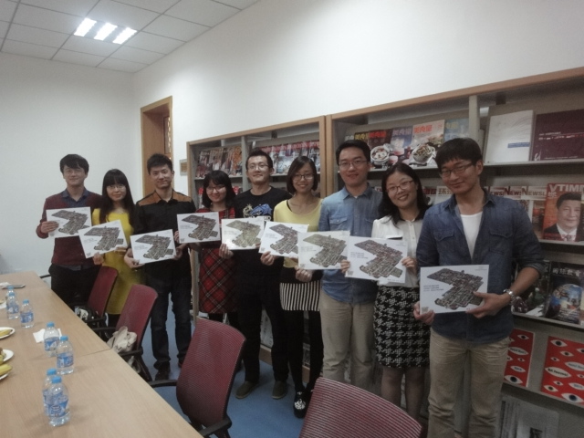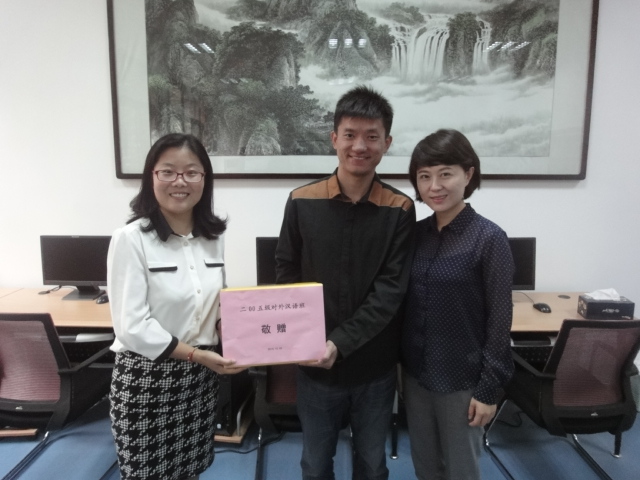 解宝起和赵亚荣代表2005级员工们将一套中华书局珍藏版“四大名著”赠送给公司。11级和12级的在校生代表公司将师大手绘地图(汉公司特别版)赠送给各位学长学姐。手绘地图背面附有公司全体老师的签名,体现出浓浓的师生情意。