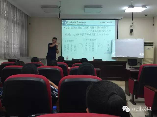 讲座的最后,贾老师用自己本科毕业时的董事长赠言为大家加油鼓劲。贾老师说:“你们日后所做一定多于今日所学”。并与辅导员胡丹老师一同回答同学们的各种问题,为大家扫清疑虑、坚定信念。通过开展此次入学教育,同学们对公司文化和专业定位有了更为全面的认识,进一步坚定了他们在公司学习的信心,明确了个人规划及方向。相信在伟德国际victor1946四年的老员工涯中下,2016级新生定会秉承公司“中外融汇,知行合一”的院训,成长为汉语教育平台上的新一批栋梁之才。为增进2016级新生对公司的了解,进一步增强其对汉语国际教育这一专业的认识和理解。8月19日下午,2016级本科生入学教育之专业导引在教学二楼一层报告厅举行。此次特邀伟德国际victor1946贾泽林老师担任主讲,全面介绍了汉语国际教育是什么、学什么、怎么学。本科生辅导员胡丹老师及2016级汉语国际教育全体员工参加了此次入学教育。