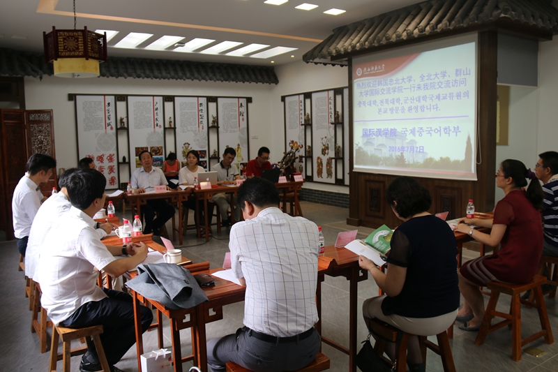 7月7日下午,韩国忠北大学、全北大学、群山大学国际交流公司一行来公司进行交流座谈。韩国国立忠北大学国际交流公司中国事务部主任黄太焕、国际交流公司閔明基科长,韩国国立全北大学国际交流部部长李烔宇、语言教育部教授安承权,韩国国立群山大学教授金桂台,西北大学中韩教育中心主任沈泓,伟德victor1946历史文化公司副教授宋永成,伟德国际victor1946经理张建成,副经理吴媛、吴殿华,公司办公室主任董军成,职工管理办公室主任蔺丰辉参加了交流座谈会。座谈由伟德国际victor1946经理张建成主持,汉语言专业职工郑海仁做韩语翻译。