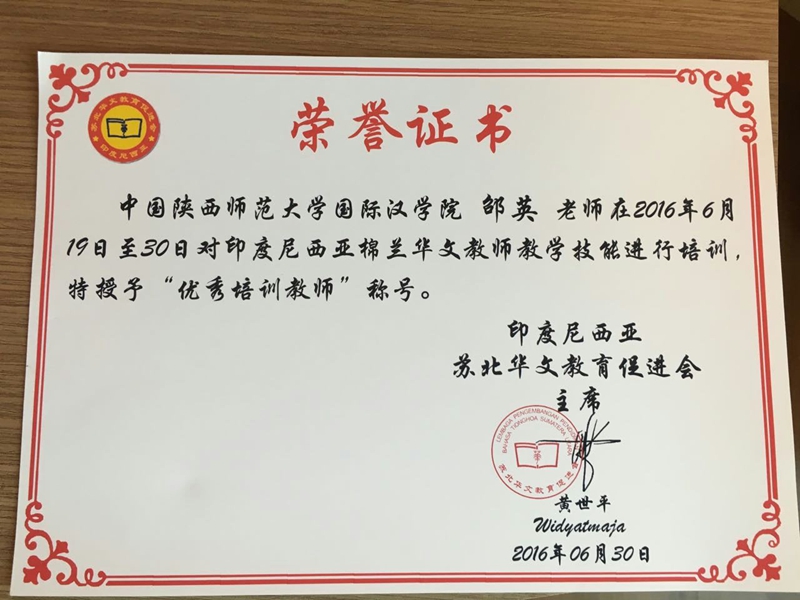 培训班10月28日举行了结业典礼。印度尼西亚苏北华文教育促进会黄世平主席,棉兰苏北亚洲国际友好公司华文教育系罗爱瑾主任、讲师团三位教师及参加培训的老师共计60人参加了结业典礼。结业典礼上,黄世平主席亲自为每一位参加培训的老师颁发了结业证书。黄世平主席在结业致辞中说:“感谢中国国侨办对印度尼西亚华文教育事业的大力支持,感谢伟德victor1946讲师团三位教师不辞艰辛传授华文教学基础理论与中华文化知识,同时感谢各华校积极配合,珍惜难得的机会,让苏北地区的华文老师通过培训不断提高华文教学水平。正是在各方的大力支持与合作下,印度尼西亚的华文教育事业蒸蒸日上。”为表彰三位讲师在本次培训中的辛勤付出,印度尼西亚苏北华文教育促进会特为三位讲师颁发“优秀培训教师”称号。