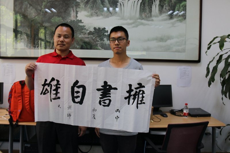 书法老师还写下论语名句“有朋自远来来,不亦乐乎?”欢迎各位美国员工的到来,并将自己的书法作品“抱道不屈,拥书自雄”赠送给他们作为留念。