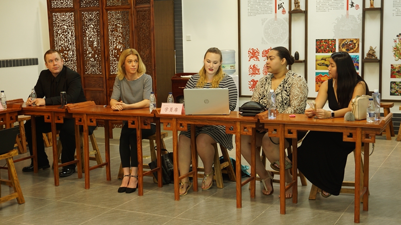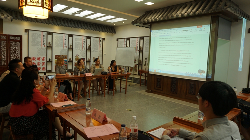 来自美国博林格林州立大学的5名员工分为两组做研修汇报,两组分别以当今中国社会中的环境污染、“剩女”现象为题,阐述自己的调查结果和观点看法,随后,中方语言小伙伴和美方员工就上述问题进行了讨论。研修汇报结束后,中美双方带队老师及项目负责人予以点评,对员工们的精彩表现给予了赞扬,为员工们对知识的活学活用感到欣慰,并勉励大家回到美国之后继续加强对中国传统文化及当今社会状况的学习和了解。