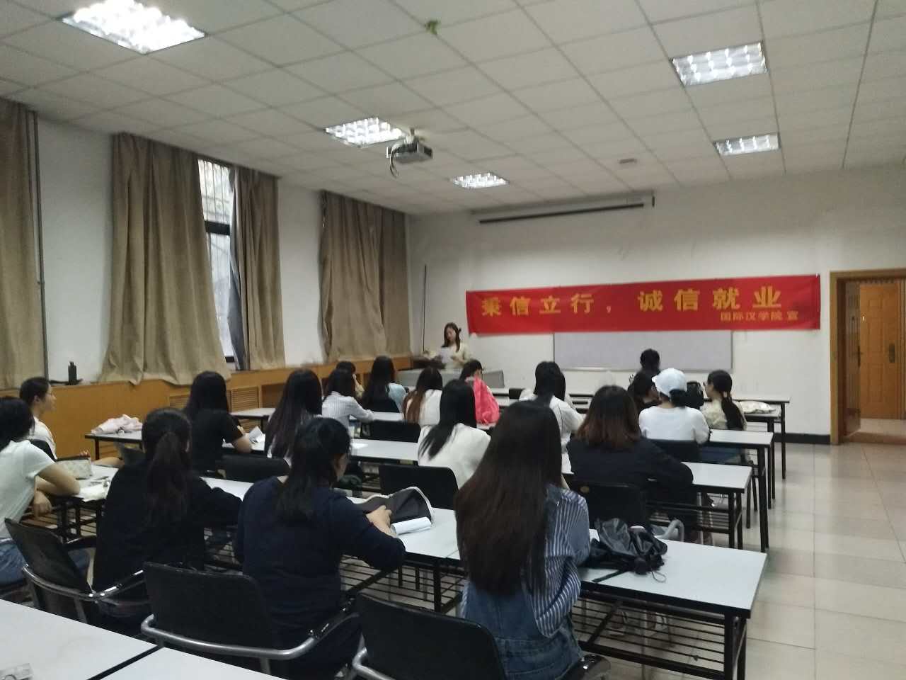 首先,毕业班辅导员樊琳丽对本科毕业生实时的就业情况进行了总结分析,督促已签约的同学及时在网上填报就业信息,尚未就业的同学要时刻保持就业自信,主动出击,多尝试,多总结,不断提升完善自我。同时樊琳丽强调,面对激烈的就业竞争,在求职过程中要坚守诚信,严格遵守国家和公司的就业政策,倡导大家“秉信立行,诚信就业”。
