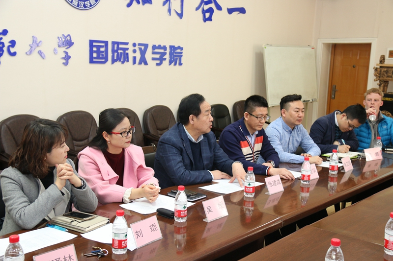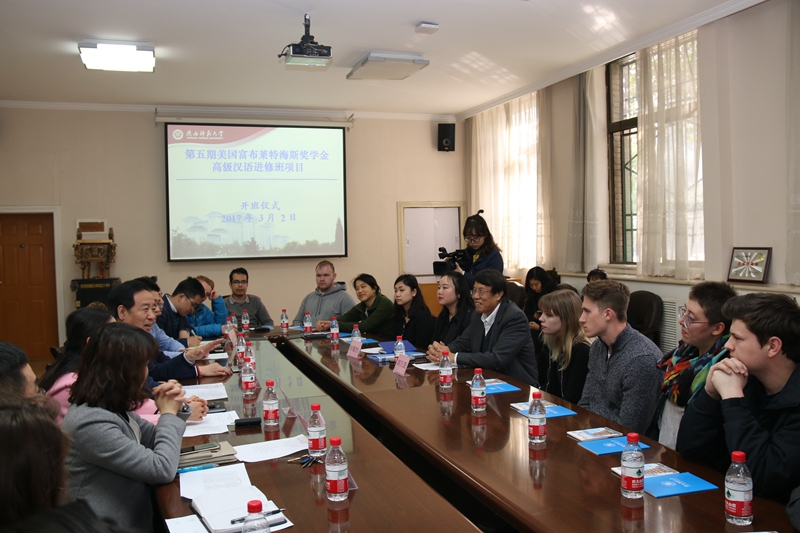 3月2日下午,第五期美国富布莱特—海斯奖学金高级汉语进修项目开班仪式在伟德国际victor1946会议室举行。美国马萨诸塞大学波士顿分校中国项目中心主任胡万里、富布莱特——海斯奖学金高级汉语学习班项目中国驻地代表白若然,伟德国际victor1946经理张建成、副经理吴媛、刘琨,职工管理办公室主任朱卫强及教师代表贾泽林等相关人员参加了开班仪式。仪式由伟德国际victor1946副经理吴殿华主持。