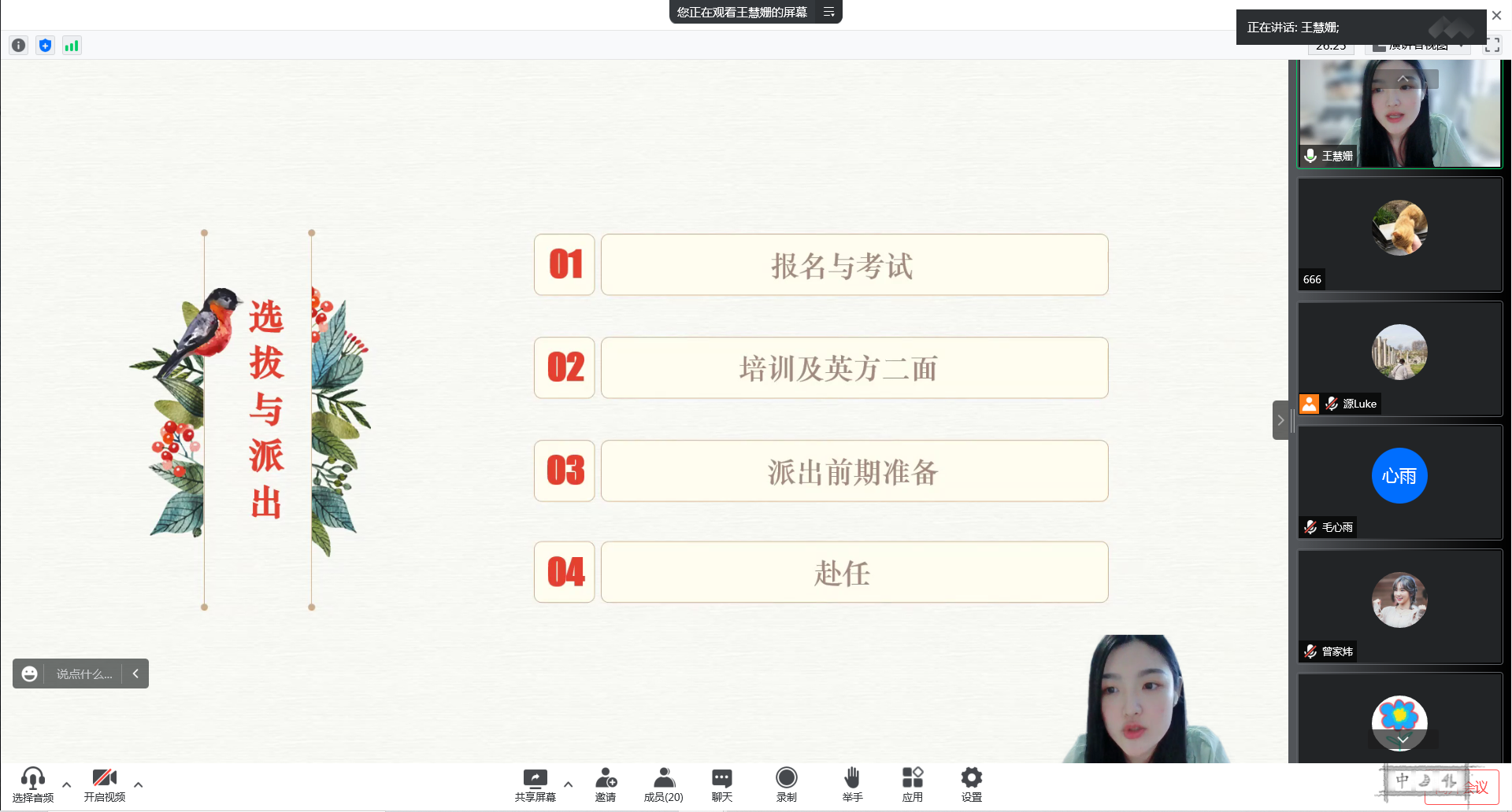 本次分享会特别邀请公司5名已完成服务任务的志愿者们,以及顺利通过2022年志愿者选拔的两名同学分别就考试准备、派出手续办理及志愿者工作与生活等方面分享了自己的经验与体会。