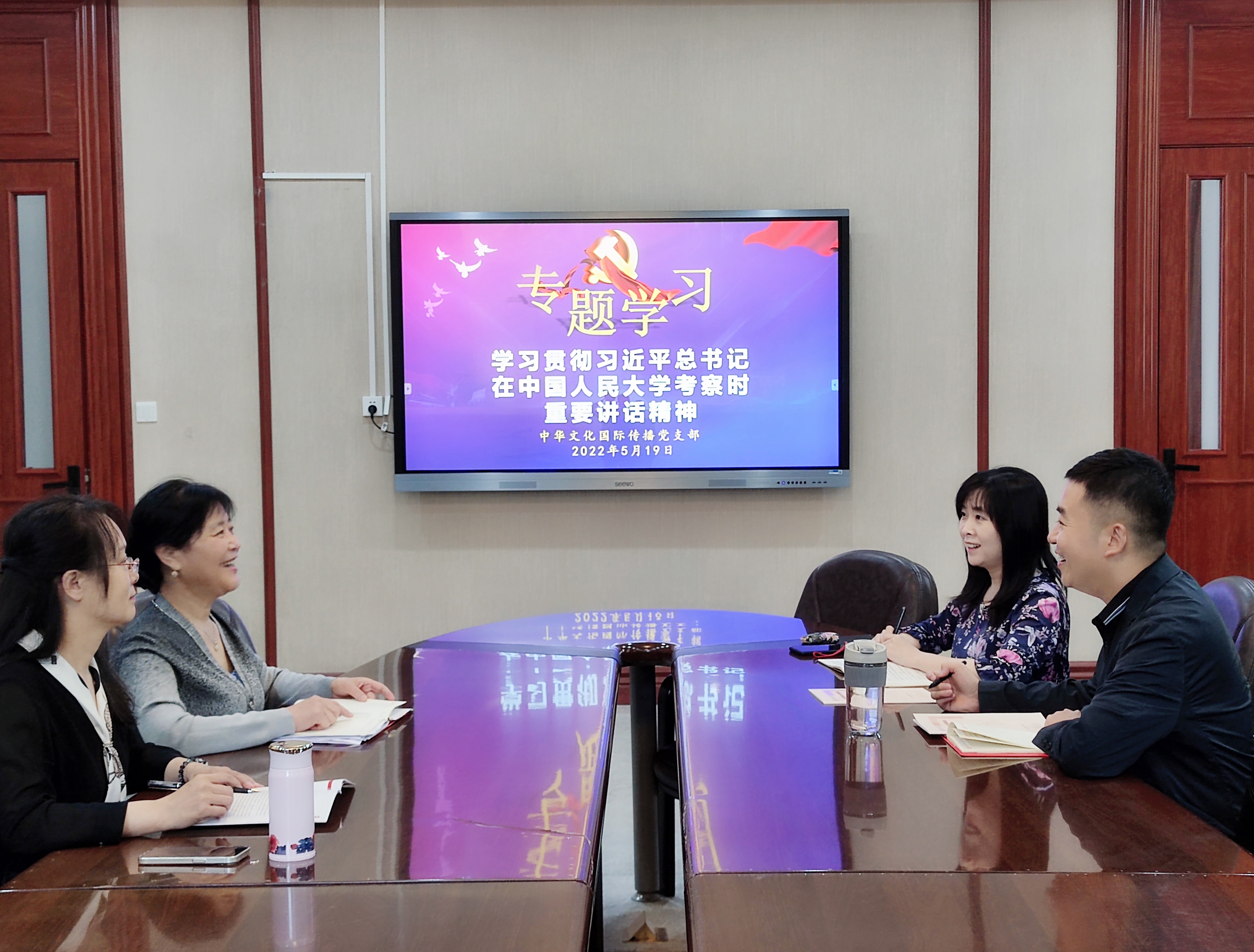 2022年5月19日上午,中华文化国际传播党支部开展专题理论学习活动,此次活动的主要议题是“学习贯彻习近平总书记在中国人民大学考察时重要讲话精神”。活动由支部书记邵英主持。