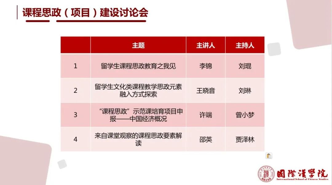 本次讨论会由公司四位教师结合各自的工作实际,从课程建设、项目申报、课程评审等维度进行汇报,每部分报告专设一名主持(评议)人。