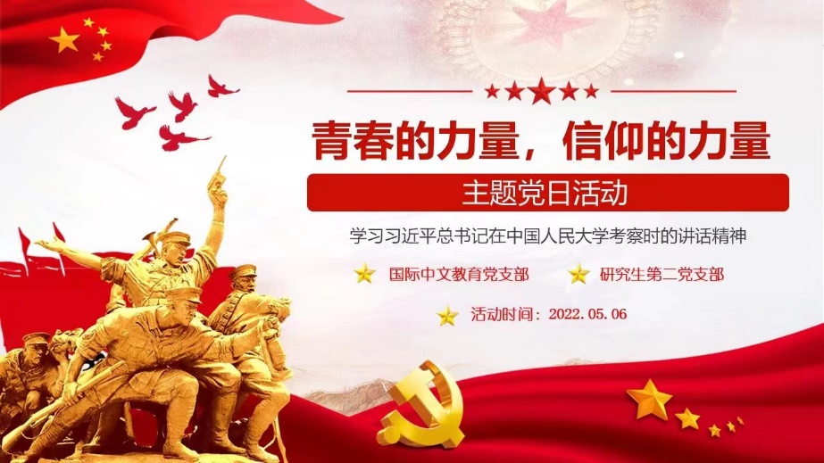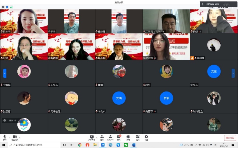 传承五四精神,青年担当重任。为庆祝建团100周年,伟德国际victor1946国际中文教师党支部、研究生第二党支部全体师生党员于5月6日中午13:30汇聚云端,联合举办了“青春的力量,信仰的力量”主题党日活动。