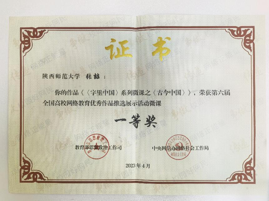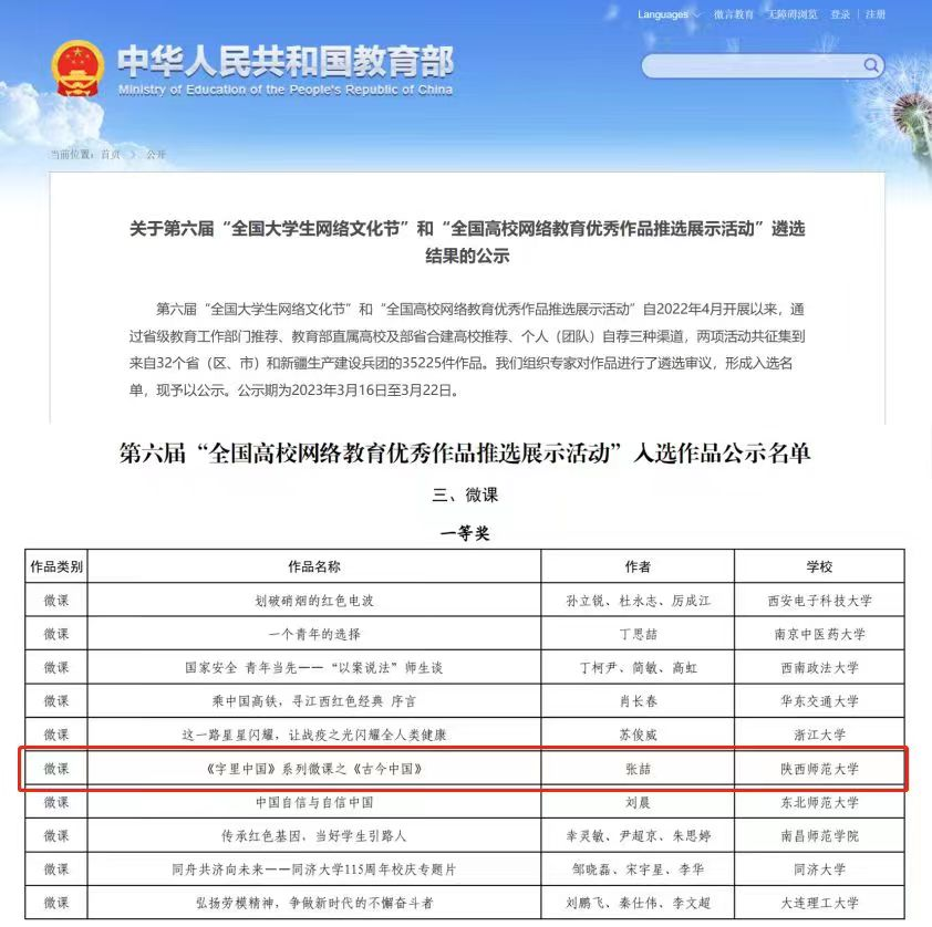 近期教育部公布了第六届“全国高校网络教育优秀作品”获奖课程,公司张喆副教授主讲的“《字里中国》系列微课之《古今中国》”荣获一等奖